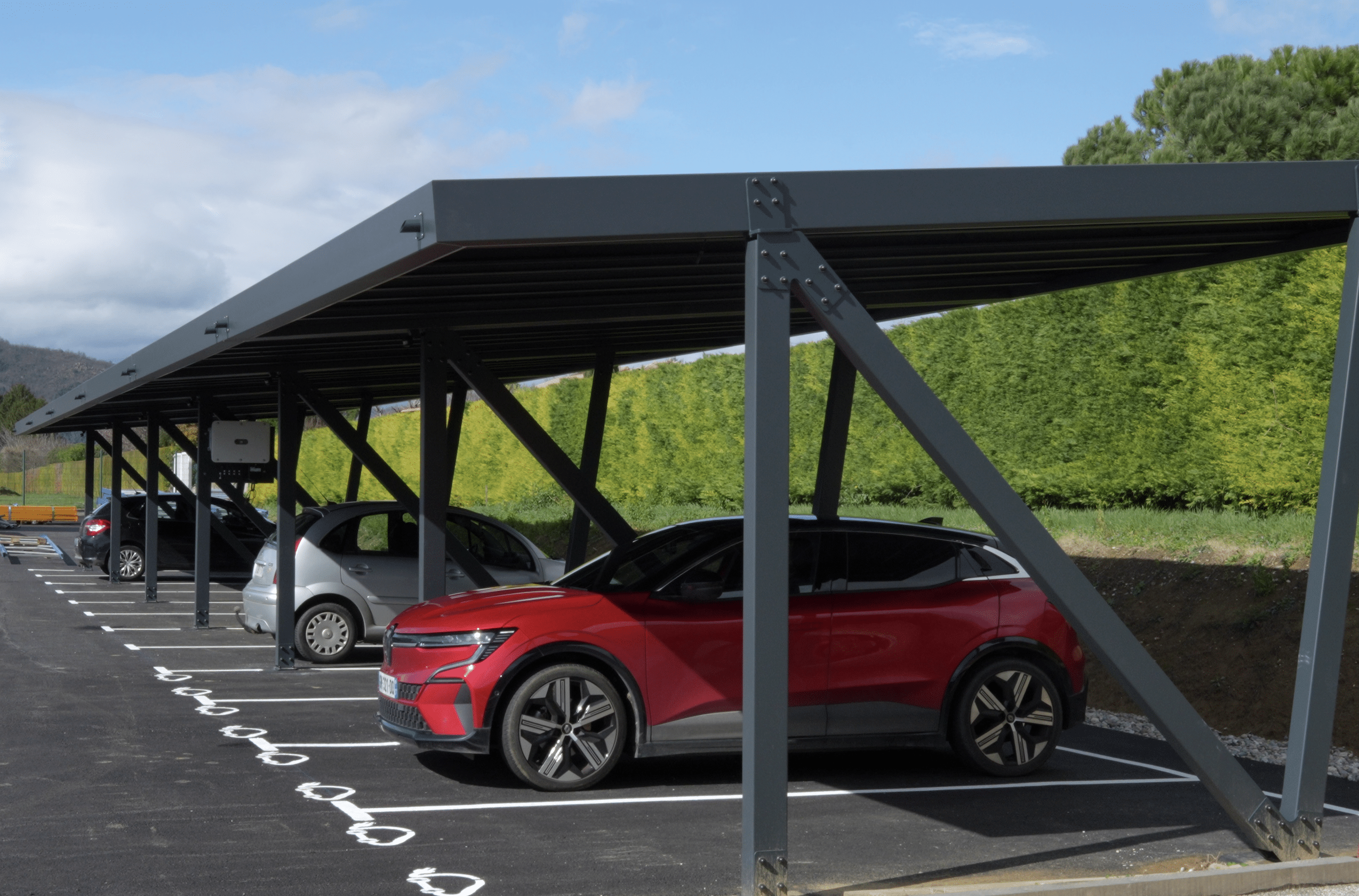 Carport PV gamme particulier et petit tertiaire, 2 places (6KWc et Genhome 4KWc) et 1 place PMR (4,5KWc) ainsi que gamme tertiaire, 2 places (5,4KWc) et 1 place PMR (4,05KWc) en pieds déportés.